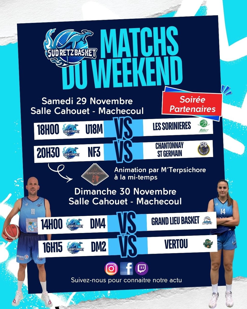 Samedi 29 novembre dès 18 h 30 → Salle Cahouet, Machecoul. Nous vous invitons à venir partager un moment convivial avec Sud Retz Basket !. Au programme :🏀 Match NF3 vs Chantonnay – 20h30✨ Show M’Terpsichore à la mi-temps🥂 Et surtout… un verre de l’amitié offert à toutes le...