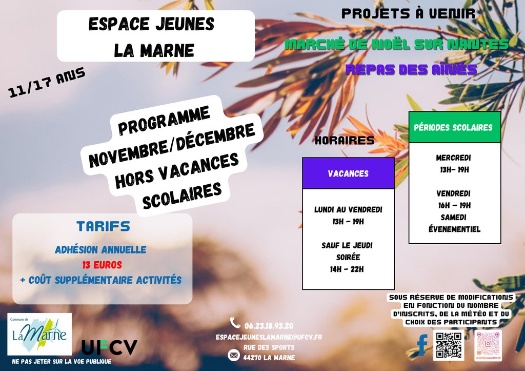 Retrouvez en pièce jointe toutes les activités proposées. par l'Espace jeunes pour Novembre et Décembre (Hors vacances scolaires).. Espace Jeunes la Marne : 06 23 18 93 20. espacejeuneslamarne@ufcv.fr.