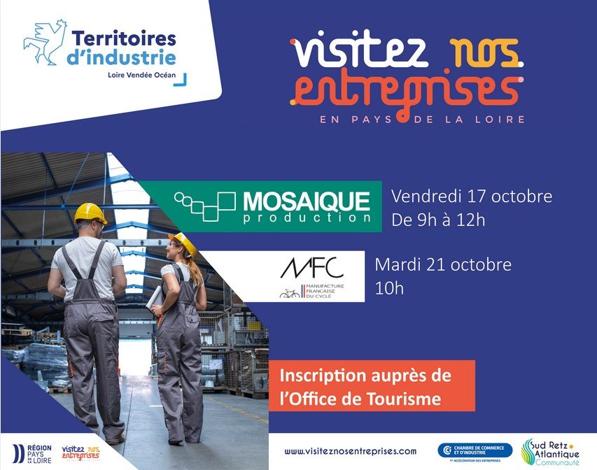 Visitez nos entreprises en Pays de la Loire. . Visite jeudi 16 octobre à 9h et 14h30 de MOSAIQUE PRODUCTION. . Visite mardi 21 octobre à 10H de MFC. Inscription auprès de l'Office de Tourisme de Machecoul Saint Même