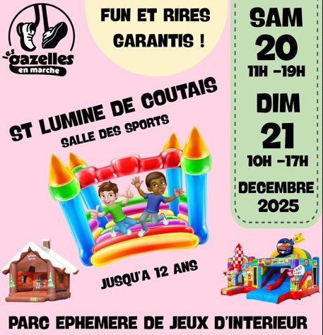 Les Gazelles en Marche vous proposent . SAMEDI 20 ET DIMANCHE 21 DECEMBRE. Un PARC EPHEMERE DE JEUX D'INTERIEUR. Salle des sports de SAINT LUMINE DE COUTAIS. Voir les modalités en pièce jointe.. (jusqu'à 12 ans)