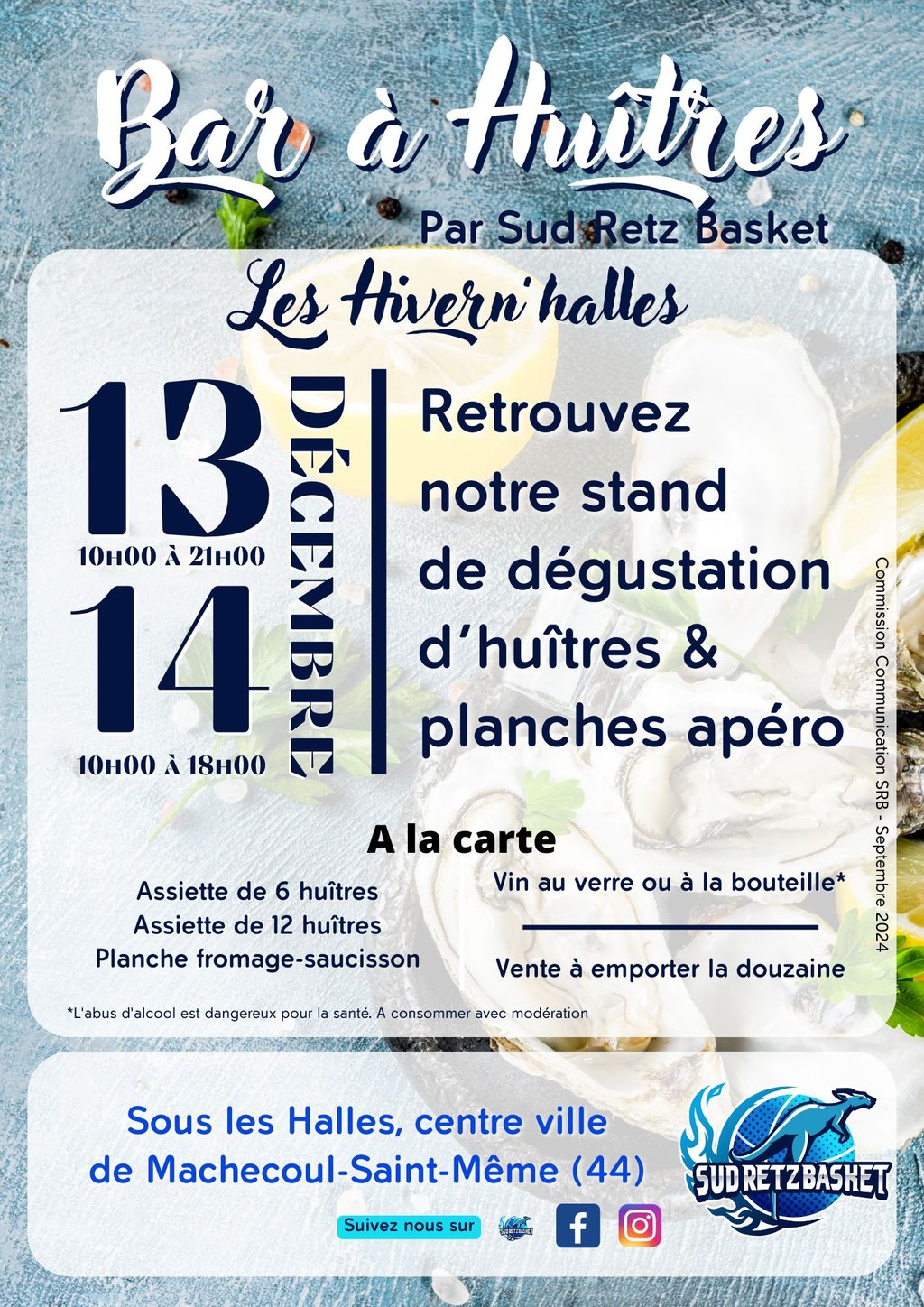 Samedi 13 et dimanche 14 décembre 2025Sous les Halles de Machecoul. Retrouvez Sud Retz Basket aux Hivern’halles pour un moment gourmand et convivial !Au menu : assiette d’huîtres locales de la baie de Bourgneuf ou planche gourmande, le tout servi dans la bonne humeur par notre équipe.. Venez ...