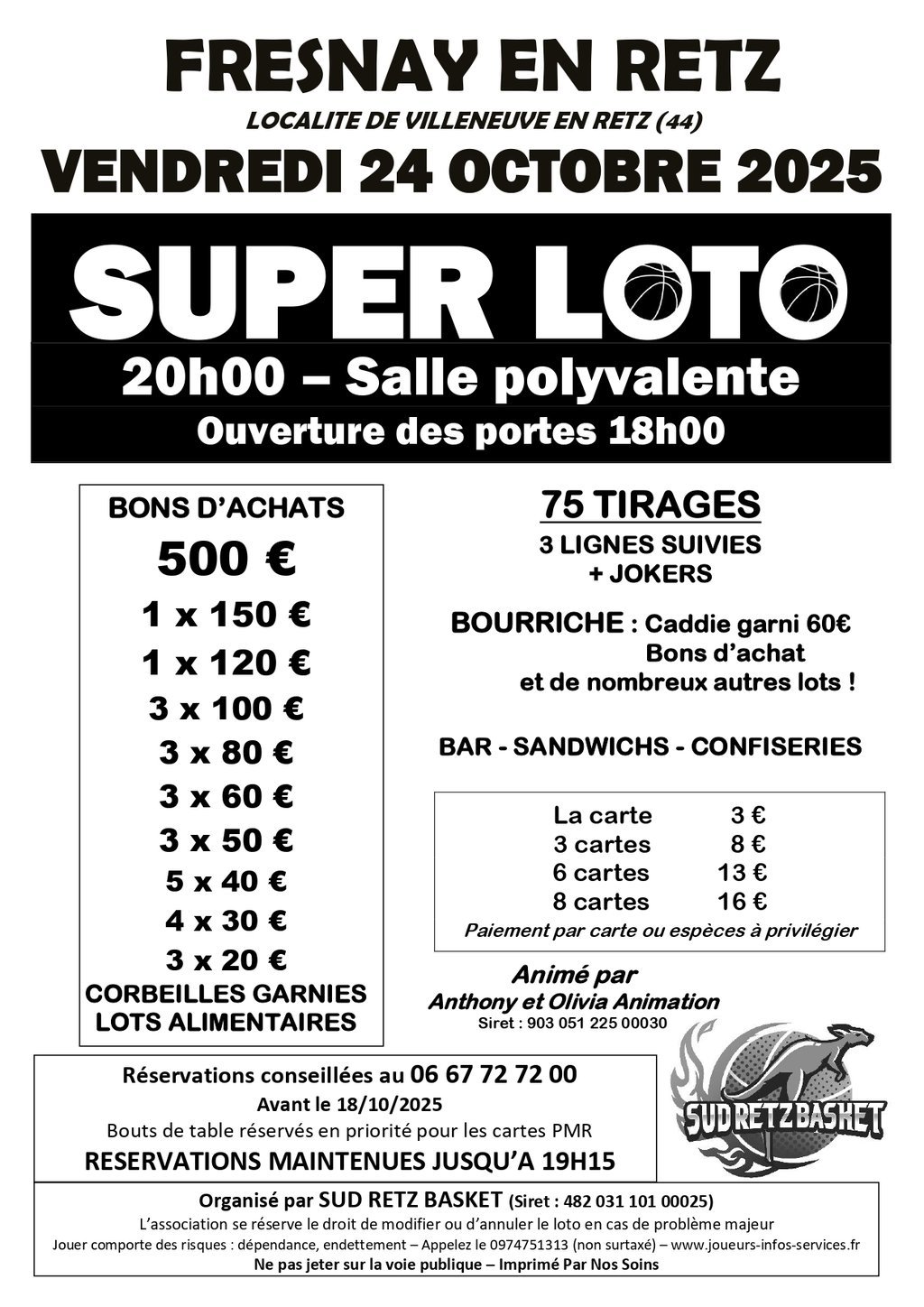 Sud Retz Basket organise son Super Loto le vendredi 24 octobre 2025 à Fresnay-en-Retz (salle polyvalente).Ouverture des portes à 18h, début des tirages à 20h.. 👉 Plus de 75 tirages, des bons d’achats jusqu’à 500 €, une bourriche garnie et de nombreux lots à gagner.🥪 Bar, sandwiches...